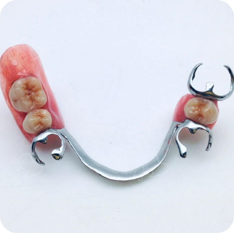 Бюгельный протез представляет собой съемную конструкцию, состоящую из искусственных зубов с имитирующим десну основанием, установленную на литую металлическую дугу (бюгель).