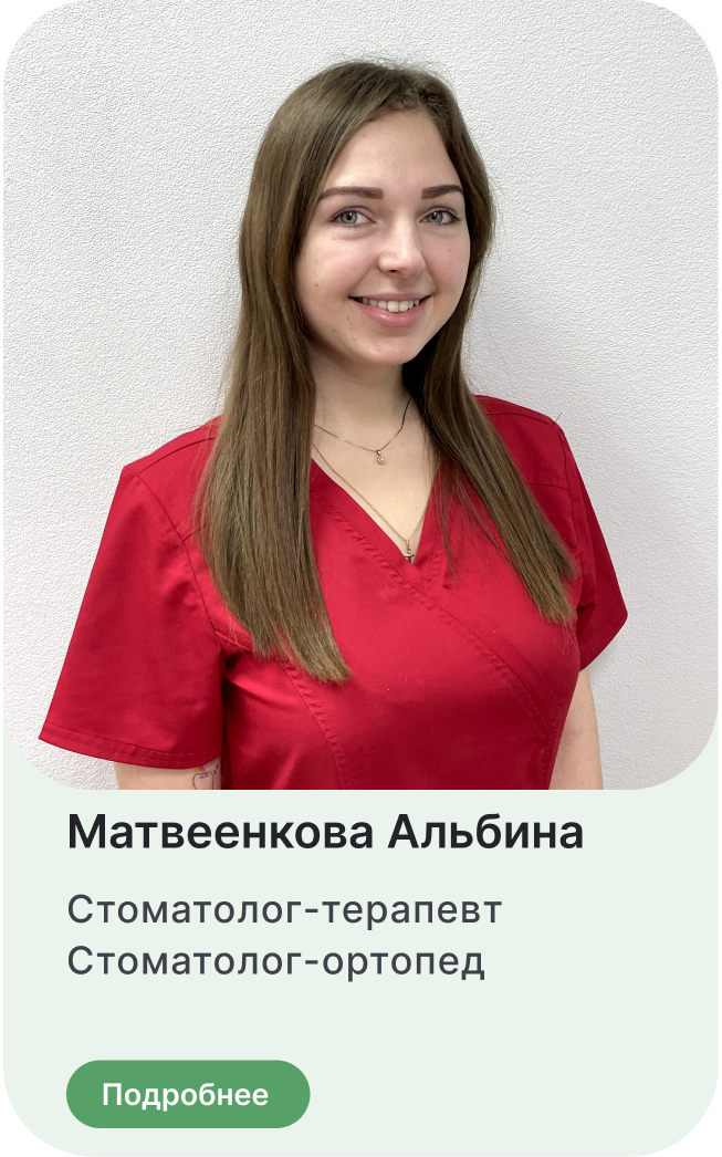 Альбина Владимировна - широкопрофильный специалист, у которого пациент проходит первичный осмотр и диагностику зубодесневого аппарата. Ее основная задача – вовремя обнаружить причины возникновения заболевания в полости рта, чтобы своевременно приступить к лечению и восстановлению функции. Владеет современными методами диагностики и лечения. Доктор поможет Вам на протяжении всех этапов: от лечения зубов до восстановления дефектов, связанных с их потерей. Постоянно посещает курсы и мастер-классы для улучшения навыков и приобретения новых знаний в области стоматологии. Свою работу воспринимает как дело всей своей жизни.